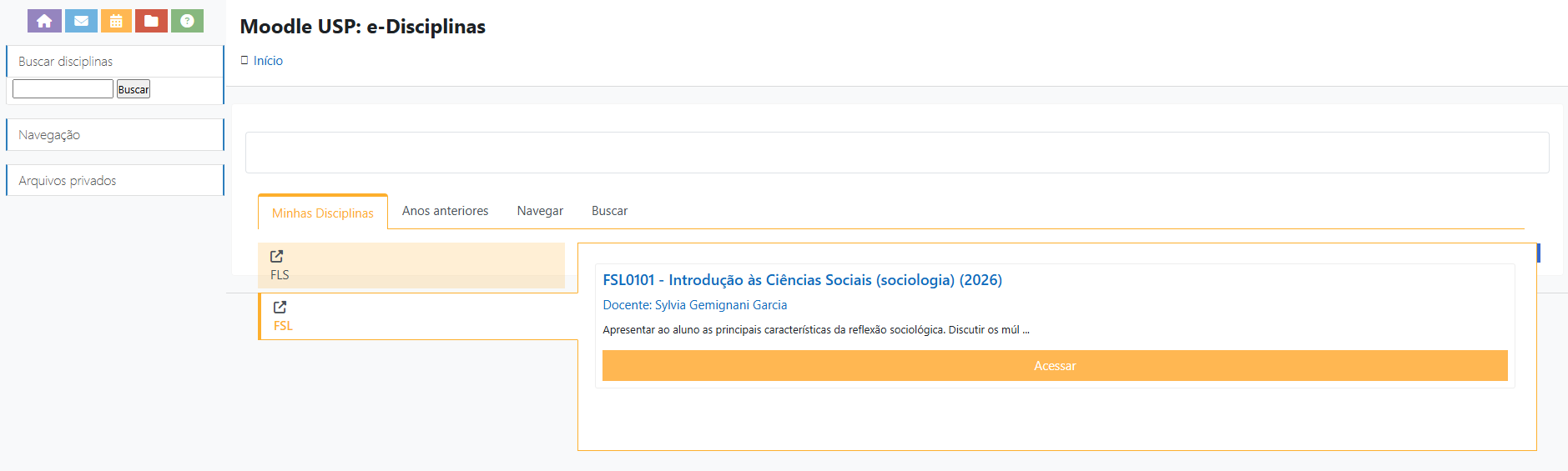 Os professores utilizam a Plataforma Moodle (USP e-Disciplinas) para emitir comunicados, disponibilizar os textos e fazer alterações no programa. Para acessar o Moodle, basta inserir as suas credenciais como número USP ou o e-mail USP e a senha que vocês utilizam. Na guia “Meus Ambientes”, vocês poderão localizar a disciplina, conforme a imagem abaixo: